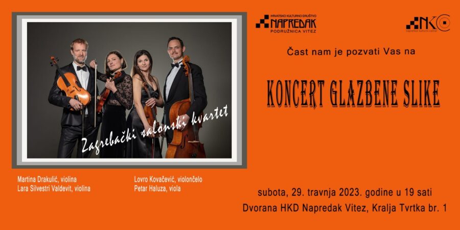 Ovoga puta u subotu, 29. travnja 2023. poziva na Koncert glazbene slike, koji izvodi Zagrebački salonski kvartet u dvorani HKD Napredak Vitez s početkom u 19,00 sati.