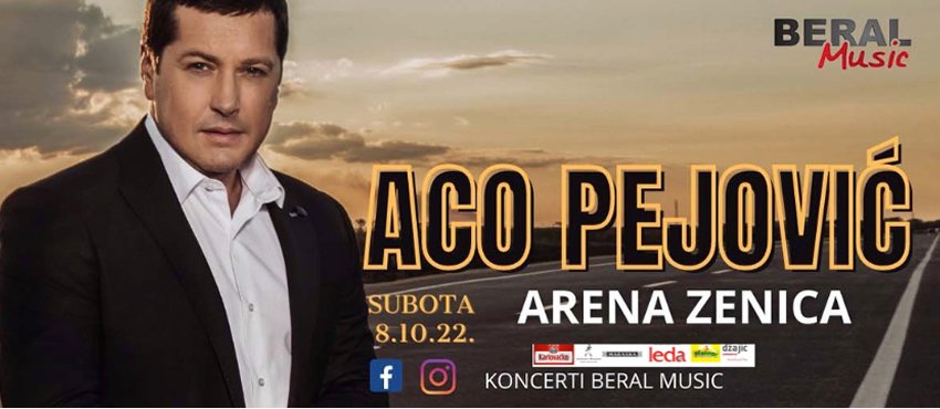Datum: 08/10Mjesto: Arena Husejin Smajlović Zenica, ZenicaKonačno dugo očekivani koncert jednog od najtraženijih izvođača Ace Pejovića ,zakazan je za subotu 08.10.2022. od 20h u areni Husein Smailović u Zenici.Ulaznice u prodaji po cijeni od PARTER 20KMTRIBINA 25KMVIP TRIBINA 50KMVIP BS 70KM (visoki sto kraj bine za 4 osobe bez stolica)Za sve info pratite naše oficijelne stranice Fb Koncerti Beral music ,instagram stranicu @beralmusic