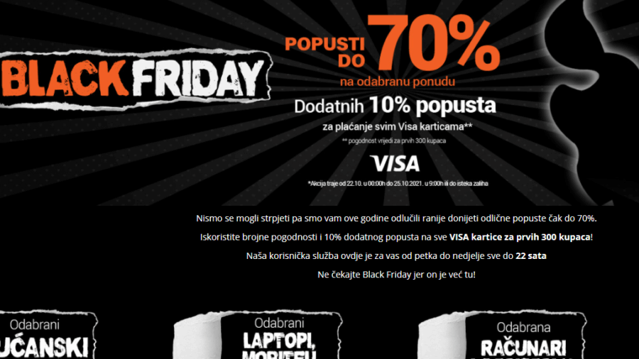 Black friday kako su nazvali popuste dosežu čak i do 70% na odabrane artikle, a s obzirom da je najavljeno da je obavezna zimska oprema već od 1. studenog, u ponudi su odlične cijene zimskih guma i opreme.