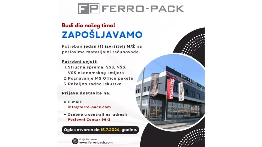 Poduzeće FERRO-PACK d.o.o. Vitez raspisuje oglas za prijem u radni odnos na radno mjesto: Materijalni računovođa – broj izvršitelja jedan (1) ( m/ž ).