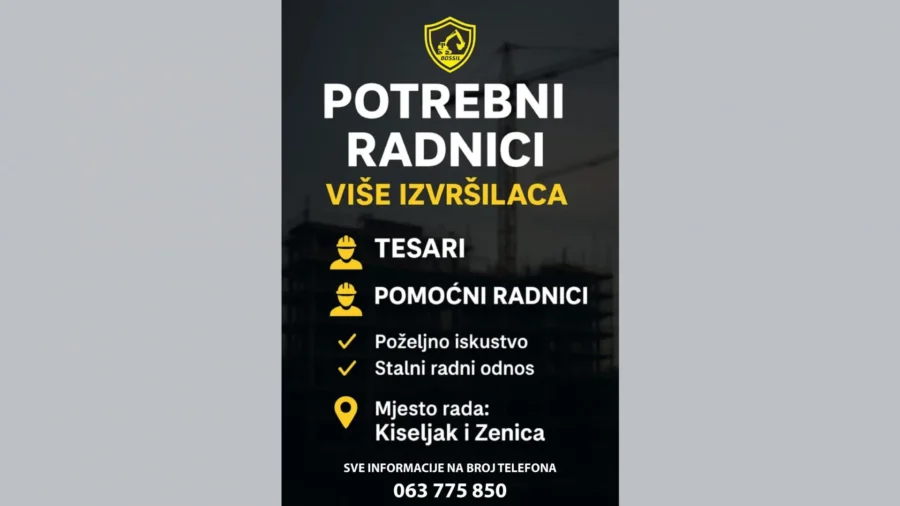 Građevinska tvrtka Bossil objavila je potrebu za većim brojem novih radnika na poslovima u Kiseljaku i Zenici. Riječ je o zapošljavanju tesara i pomoćnih radnika, a kandidatima se nudi stalni radni odnos uz mogućnost napredovanja.
