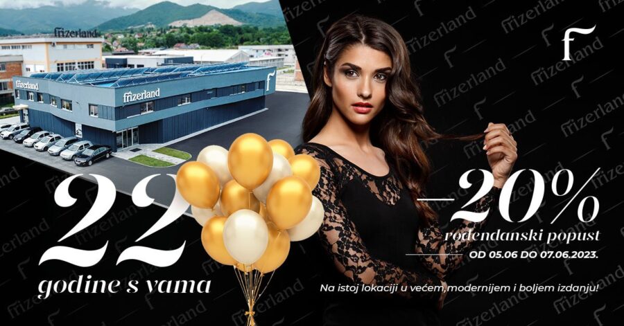 Poduzeće Frizer Land d.o.o. sa sjedištem u Vitezu, u ponedjeljak će proslaviti svoju 22. godišnjicu postojanja uz 20% popusta na cjelokupnu ponudu u svim svojim poslovnicama kao i na web trgovini, a rođendansko sniženje trajat će od ponedjeljka do srijede, od 5. do 7.6.2023.