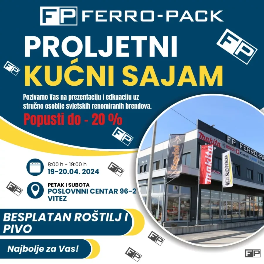 Najavljen je novi proljetni kućni sajam u Ferro-Packu u Vitezu. Naime, i ove godine na Proljetnom kućnom sajmu Vas čekaju popusti do 20% na datume: 19.4.2024. – petak i 20.4.2024. – subota.