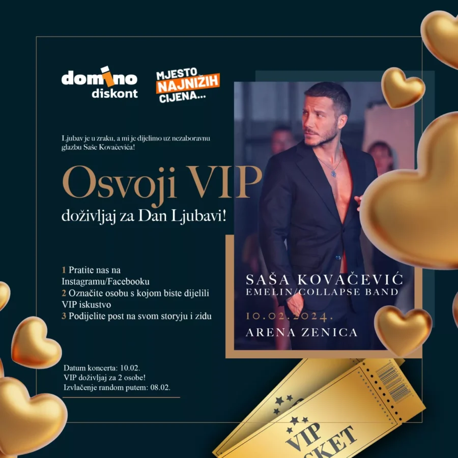 Osvojite VIP doživljaj za Dan Ljubavi! Naime, Domino diskont slavi ljubav i poklanja VIP ulaznice za koncert Saše Kovačevića u Zenici.