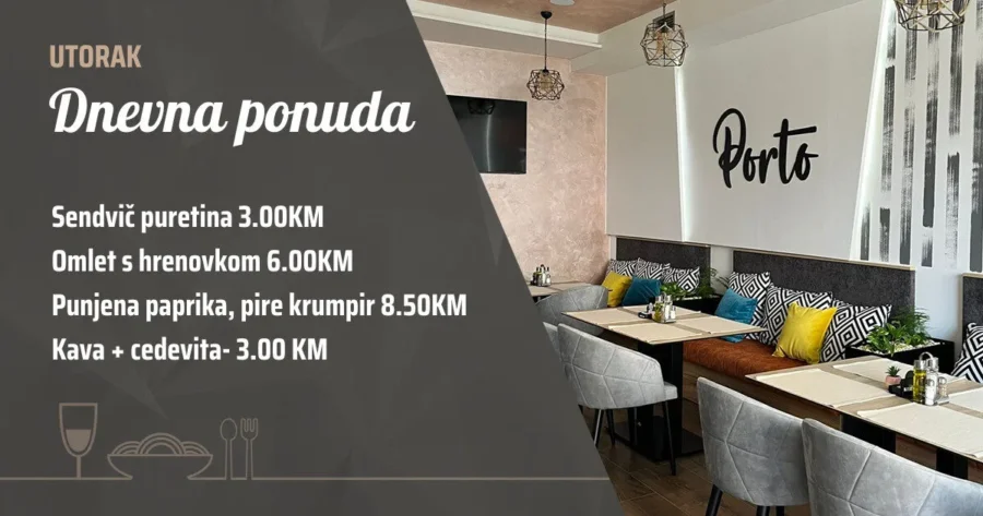 Restoran i caffe Porto u Vitezu predstavlja ponudu jela dana za utorak, 11.11.2025. godine pri čemu se ističu punjene paprike s pireom. sendvič s puretinom te omlet. Tu je i ponuda pića, kava i cedevita za svega 3,00 KM.
