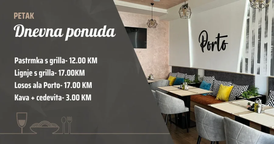 Restoran i caffe Porto u Vitezu predstavlja ponudu jela dana za četvrtsk, pri čemu se ističu pastrva s grilla i losos na više načina. Tu je i ponuda pića, kava i cedevita za svega 3,00 KM.