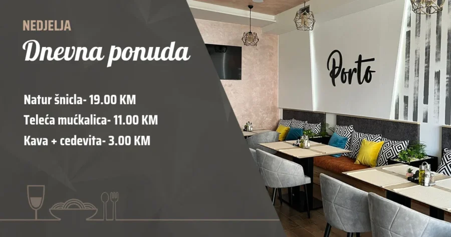 Restoran i caffe Porto u Vitezu predstavlja ponudu jela dana za nedjelju, 9.11.2025. godine pri čemu se ističu natur šnicla ili teleća mućkalica. Tu je i ponuda pića, kava i cedevita za svega 3,00 KM.