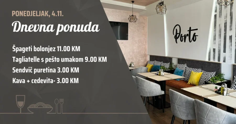 Restoran i caffe Porto u Vitezu predstavlja ponudu jela dana za danas pri čemu se ističu špageti, tagliatelle ili sendvič s puretinom. Tu je i ponuda pića, kava i cedevita za svega 3,00 KM.