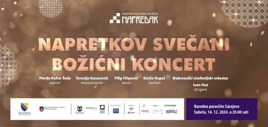 Hrvatsko kulturno društvo Napredak tradicionalno i ove godine organizira Napretkov svečani božićni koncert koji će se održati u subotu, 14. prosinca 2024. godine, u velebnom sarajevskom Narodnom pozorištu s početkom u 20:00 sati.