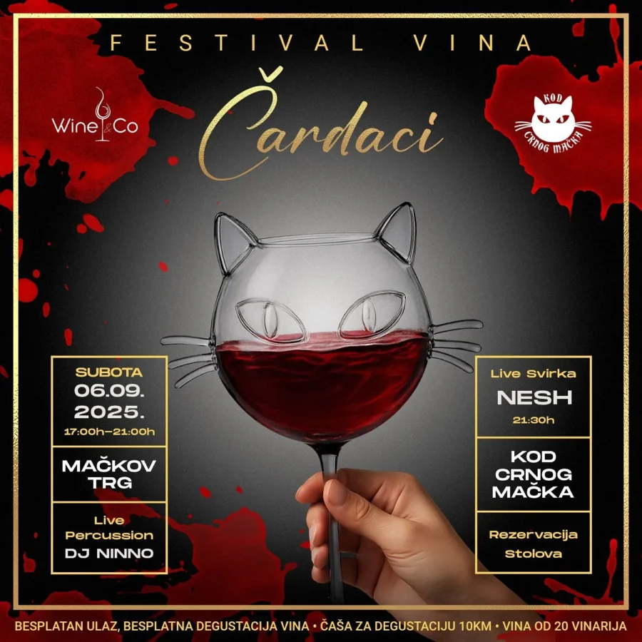 Etno selo Čardaci će u subotu, 6. rujna 2025. godine, postati središte ljubitelja vina i dobre zabave. Na Mačkovom trgu održat će se Festival vina u organizaciji Wine&Co i pivnice Kod crnog mačka.