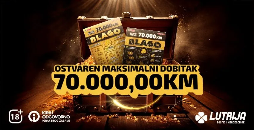 Sreća je ponovo zakucala na vrata jednog od vjernih igrača! Na novčanoj srećki “BLAGO” Lutrije Bosne i Hercegovine ostvaren je maksimalni dobitak u iznosu od 70.000,00 KM.