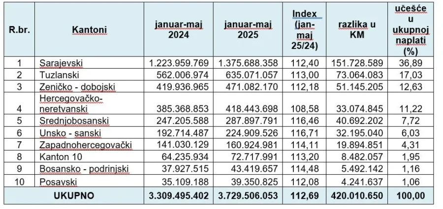 Tako su naveli da su porezni obveznici Federacije BiH u periodu siječanj-svibanj 2025. godine uplatili 3.729.506.053 KM javnih prihoda, što je u odnosu na isti period 2024. godine više za 420.010.650 KM, ili za 12,69%.