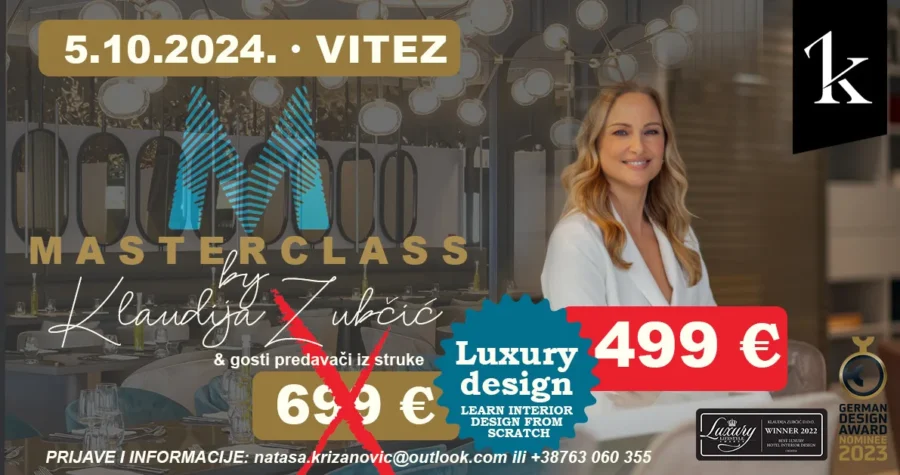Pred samim zatvaranjem je proces prijava na Masterclass s Klaudijom Zubčić u Vitezu, jedinstven i ekskluzivan program usavršavanja u oblasti dizajna i uređenja interijera koji je usmjeren za postojeće i buduće dizajnere te osobe koje su u procesu adaptacije vlastitih prostora.