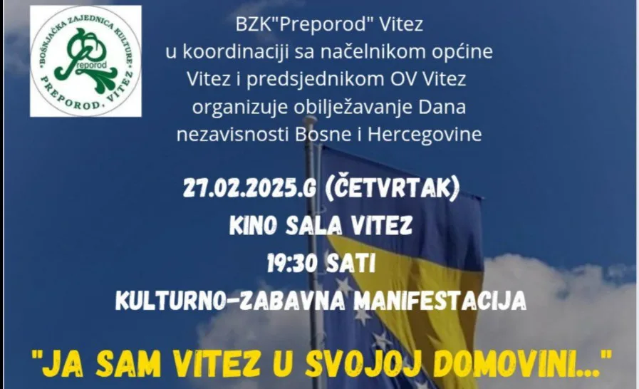 Bosna i Hercegovina 1. ožujka obilježava Dan nezavisnosti, a u Vitezu će se ovaj državni praznik proslaviti kroz kulturno-zabavni program. Bošnjačka zajednica kulture (BZK) Preporod Vitez, u suradnji s općinskim načelnikom Viteza i predsjednikom Općinskog vijeća Vitez, organizira manifestaciju pod nazivom “Ja sam Vitez u svojoj domovini”, koja će se održati 27. veljače 2025. godine u dvorani Hrvatskog doma u Vitezu s početkom u 19:30 sati.