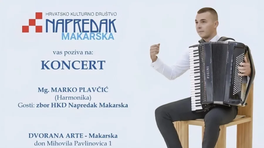 Uoči Dana grada Makarske, Hrvatsko kulturno društvo Napredak Makarska organizira koncert mladog magistra harmonike Marka Plavčića, koji će se održati u petak, 17. listopada, u Dvorani Arte u Makarskoj, s početkom u 19 sati.