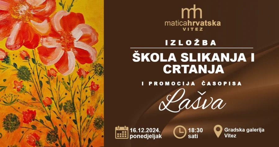 Matica hrvatska Vitez poziva sve ljubitelje umjetnosti i kulturnih događanja na izložbu pod nazivom „Škola slikanja i crtanja“, koja će biti otvorena u ponedjeljak, 16. prosinca 2024. godine, u Gradskoj galeriji Vitez s početkom u 18:30 sati.