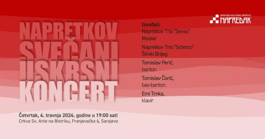 Hrvatsko kulturno društvo Napredak, povodom najvećeg kršćanskog blagdana Uskrsa, upriličit će u četvrtak 4. travnja 2024. godine u crkvi Sv. Ante u sarajevskom naselju Bistrik s početkom u 19,00 sati Napretkov svečani uskrsni koncert.