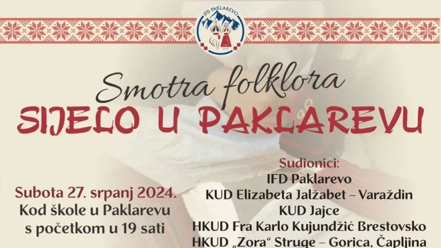 Tradicionalna smotra folklora “Sijelo u Paklarevu” najavljena je za subotu, 27. srpnja 2024. godine u 19 sati kod škole u Paklarevu.