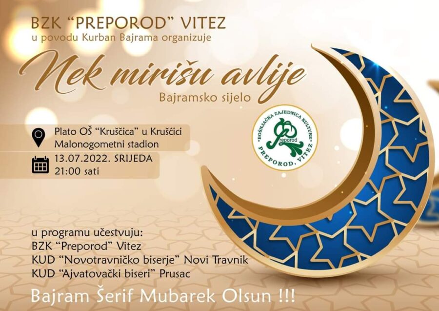 Bošnjačka zajednica kulture Preporod Vitez organizira Bajramsko sijelo „Nek mirišu avlije“ i to večeras 13.7.2022.g (srijeda), na platou Osnovne škole u Kruščici s početkom od 21:00