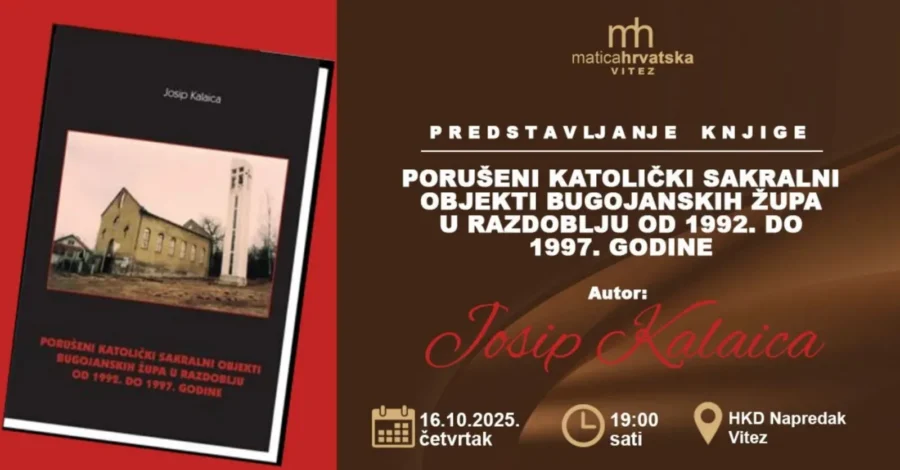 Nakon što je prije nekoliko mjeseci promocija knjige Josipa Kalaice izazvala veliku pozornost javnosti u Vitezu, Hrvatski dokumentacijski centar Domovinskog rata u BiH i Matica hrvatska Vitez pozivaju vas na predstavljanje nove knjige ovog autora pod naslovom „Porušeni katolički sakralni objekti bugojanskih župa u razdoblju od 1992. do 1997. godine“.