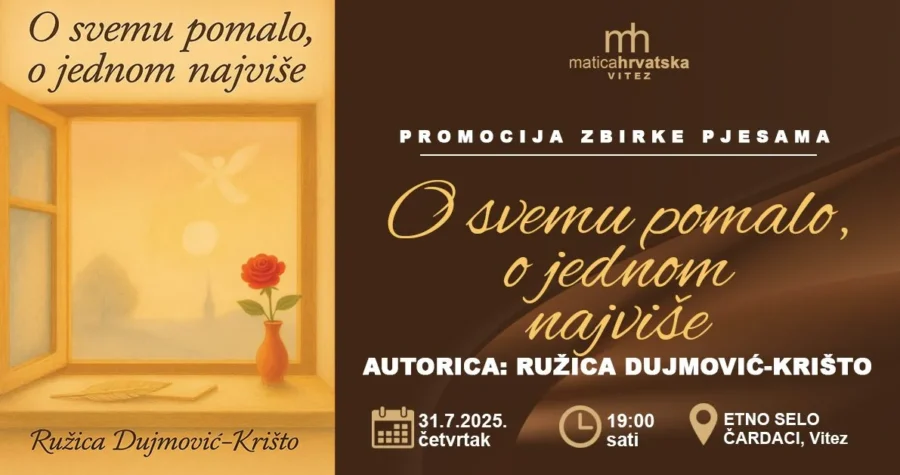 Kada vas riječi cijeloga života pronalaze same, a vi ste “tek” pero koje ih treba zapisati nastaje priča o ljubavi, obitelji, vjeri, rodnom kraju.. Prva zbirka pjesama Vitežanke Ružice Dujmović – Krišto je upravo to, a ispričana je rimama koje se na prvu čine lake, ali su sve osim toga. U nakladi Matice hrvatske Vitez i same autorice nastala je zbirka “O svemu pomalo, o jednom najviše”..