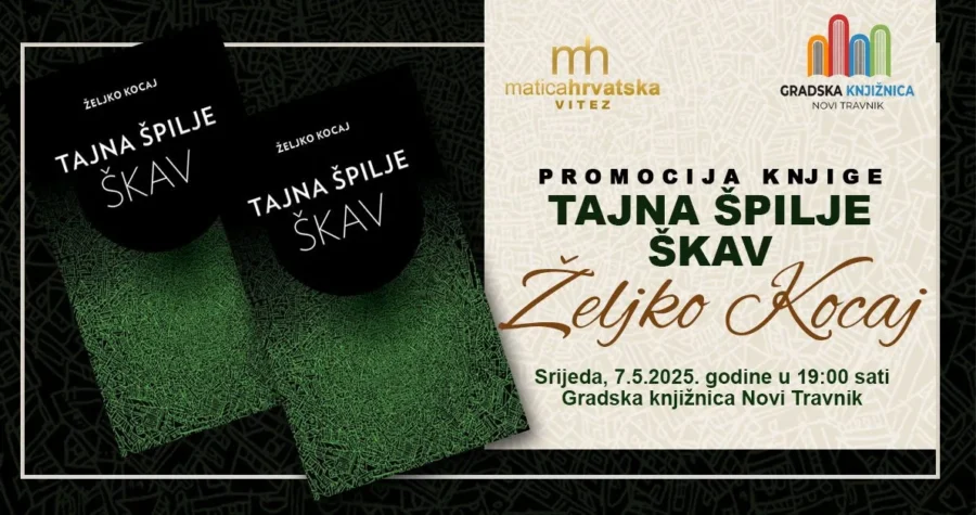 U srijedu, 7. svibnja 2025. godine, s početkom u 19:00 sati, u Gradskoj knjižnici Novi Travnik bit će upriličena promocija knjige “Tajna špilje Škav” autora Željka Kocaja.