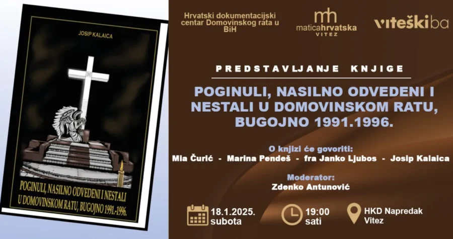 Matica hrvatska Vitez organizira promociju knjige Josipa Kalaice pod nazivom “Poginuli, nasilno odvedeni i nestali u Domovinskom ratu, Bugojno 1991.-1996.”, koja će se održati u subotu, 18. siječnja 2025. godine u dvorani HKD-a Napredak u Vitezu s početkom u 19 sati.