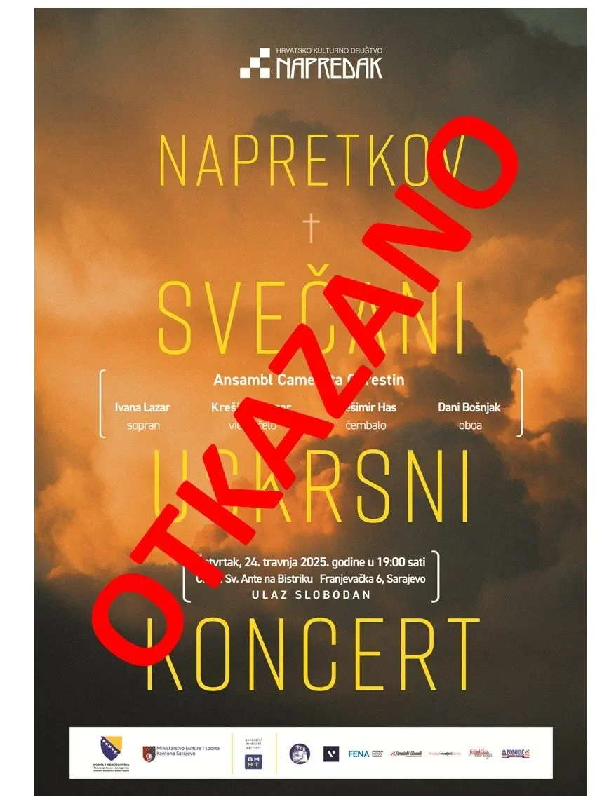 U znak pijeteta i zahvalnosti prema njegovu životu i služenju, Hrvatsko kulturno društvo Napredak otkazuje Uskrsni koncert koji se trebao održati u četvrtak, 24. travnja 2025. godine s početkom u 19,00 sati u crkvi Sv. Ante na Bistriku (ul. Franjevačka 6, Sarajevo)