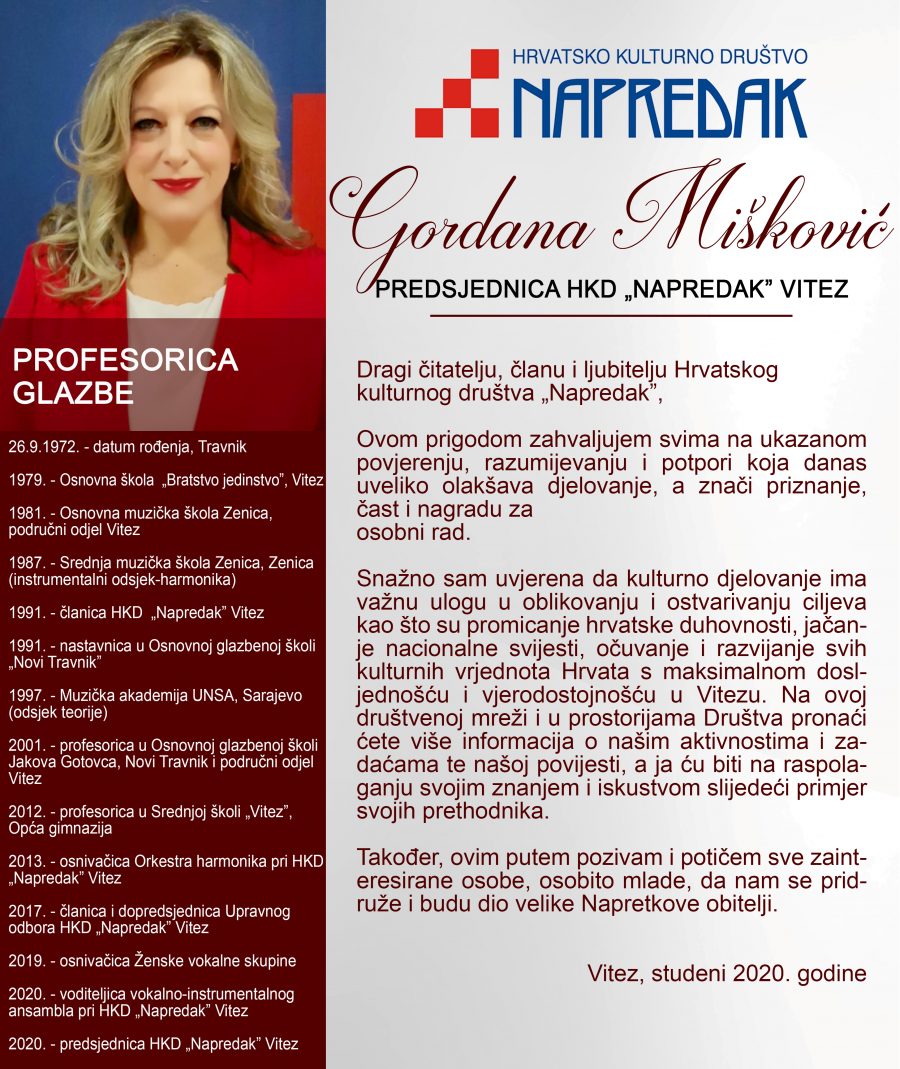 Upoznajte novu predsjednicu HKD „Napredak” Vitez, gospođu Gordanu Mišković. Riječima njezina prethodnika, došlo je vrijeme da netko novi preuzme podružnicu te ju učini boljom i kvalitetnijom zadržavajući status jedne od najaktivnijih podružnica u Bosni i Hercegovini.