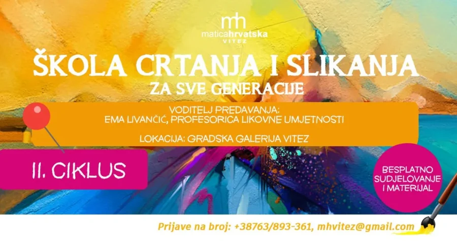 Nakon više uspješnih ciklusa, Matica hrvatska Vitez i dalje nastavlja s popularnim projektom Škole crtanja i slikanja, namijenjenim svim generacijama. Novi ciklus ovog programa održavat će se u Gradskoj galeriji Vitez (Centru za mlade), a vodit će ga profesorica likovne umjetnosti Ema Livančić.