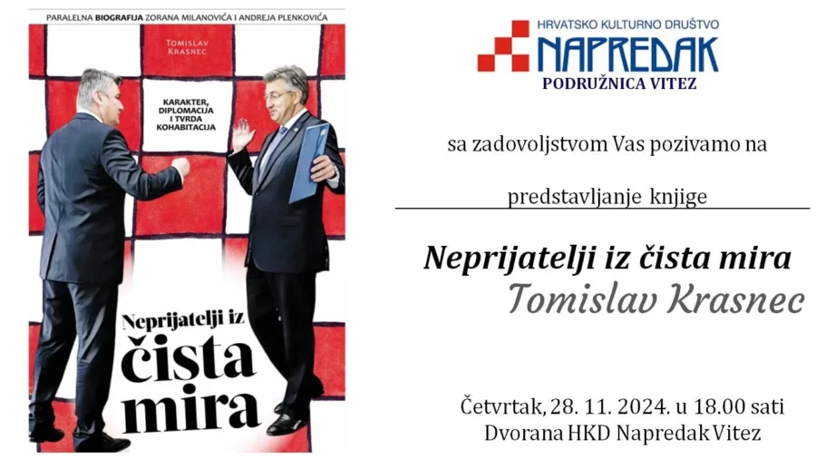 Hrvatsko kulturno društvo “Napredak” podružnica Vitez Vas poziva na predstavljanje knjige Tomislava Krasneca “Neprijatelji iz čista mira” koje će biti upriličeno u četvrtak, 28. studenoga 2024. godine, u Napretkovim prostorijama u Vitezu s početkom od 18:00 sati.