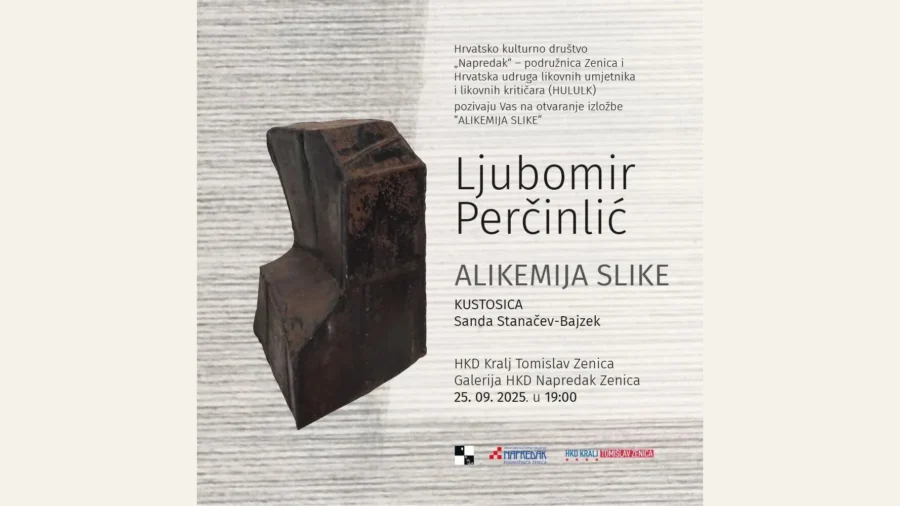 Hrvatsko kulturno društvo „Napredak“ podružnica Zenica i Hrvatska udruga likovnih umjetnika i likovnih kritičara (HULUK) pozivaju Vas na otvorenje izložbe „Alikemija slike“ akademskog umjetnika Ljubomira Perčinlića.