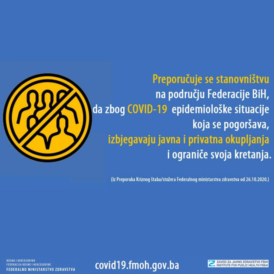 Posebna preporuka stanovništvu na području Federacije BiH jeste da zbog COVID-19 epidemiološke situacije koja se pogoršava, izbjegavaju javna i privatna okupljanja i ograniče svoja kretanja.