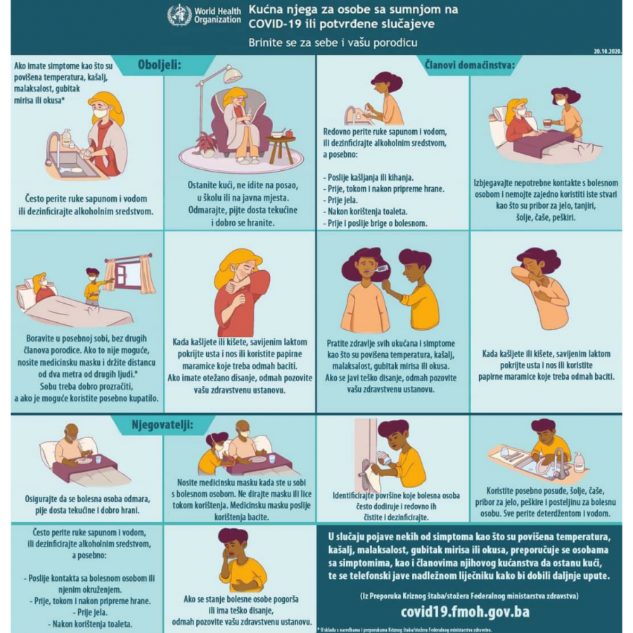 Krizni stožer Federalnog ministarstva zdravstva i dalje savjetuje osobama s određenim zdravstvenim problemima kako u slučaju pojave nekih od simptoma kao što su povišena temperatura, kašalj, malaksalost, gubitak mirisa ili okusa, kao i članovima njihovog kućanstva da ostanu kući, te se telefonski jave nadležnom liječniku kako bi dobili daljnje upute.