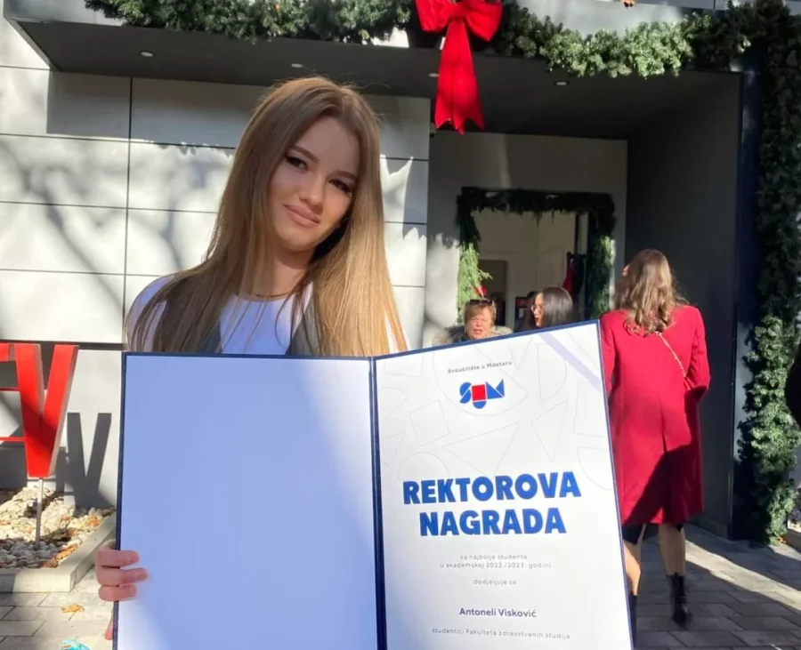 Antonela Visković, studentica preddiplomskog studija Primaljstva na Fakultetu zdravstvenih studija Sveučilišta u Mostaru dobila je Rektorovu nagradu za najbolje studente u akademskoj 2022./2023. godini, s prosječnom ocjenom 4,53.