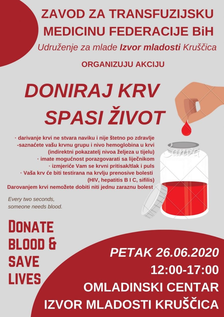 Zavod za transfuzijsku medicinu FBiH i Udruženje mladih Izvor mladosti iz Kruščice organiziraju akciju darivanja krvi pod nazivom „Doniraj krv spasi život“ koja će se održati u petak, 26. lipnja od 12:00 do 17:00 u prostorijama Omladinskog centra Izvor mladosti u Kruščici.
