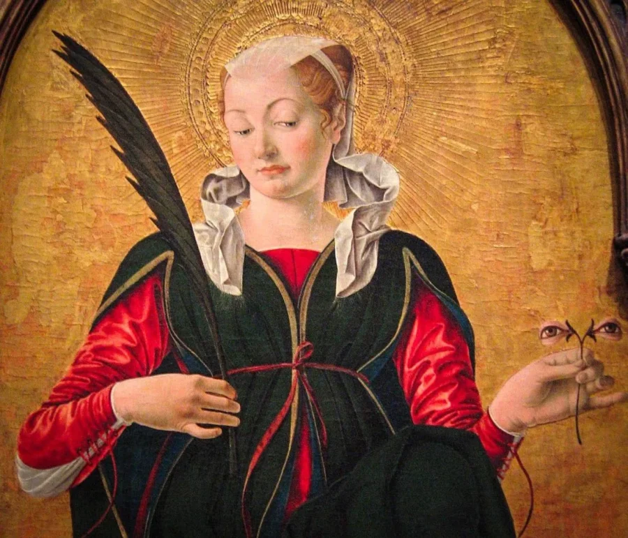 Sveta Lucija od Sirakuze (284. – 303.) zbog svoje je vjere podnijela mučeništvo 303. godine. Progonitelji kršćana mačem su joj odrubili glavu nakon dužeg mučenja. Kroz svu kršćansku povijest štuje se među kršćanima kao mnogostruka zaštitnica – slijepih (tjelesno i duhovno), ratara, lađara, staklara, krojača, tkalaca, pisara, vratara i kovača.Postoji malo pouzdanih podataka o njezinu životu, ali kako predaja kaže, dok je još bila djevojčica, otac ju je obećao nekom bogatom mladiću za ženu. Otac je ubrzo umro, a i majka Eutihija joj se teško razboljela. Velik dio imetka potrošile su na liječnike, ali joj nitko nije mogao pomoći. Bolest nije prestajala. Tada su Lucija i njezina majka krenule na grob svete Agate u Kataniju.