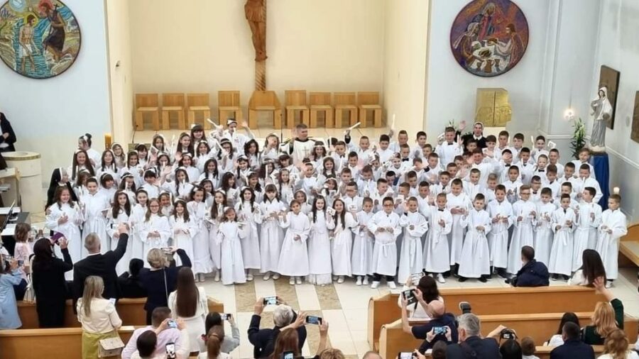 Sakrament Prve svete pričesti danas je u župnoj crkvi svetog Juraja u Vitezu primilo 105 prvopričesnika. Prvopričesnicama i prvopričesnicima sakrament Prve svete pričesti podijelio je fra Velimir Bavrka, župnik župe svetog Juraja u Vitezu