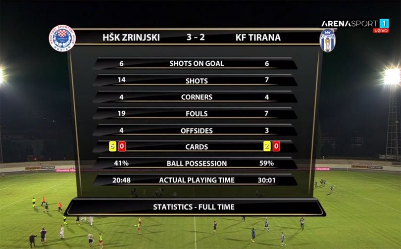 Nogometaši Zrinjskog pobijedili su Tiranu 3:2 u uzvratnom susretu 2. pretkola Konferencijske lige igranom u četvrtak navečer na stadionu Pod Bijelim Brijegom u Mostaru.