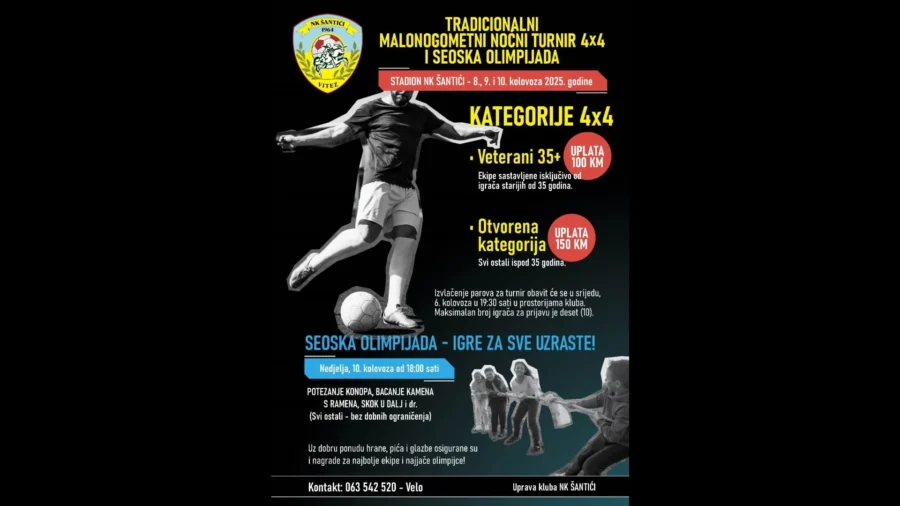 Na stadionu NK Šantići i ove će se godine, od 8. do 10. kolovoza, održati tradicionalni noćni malonogometni turnir 4×4 i seoska olimpijada, uz bogat sportski i zabavni program koji već dugo okuplja sudionike i posjetitelje iz cijele općine, ali i šire.
