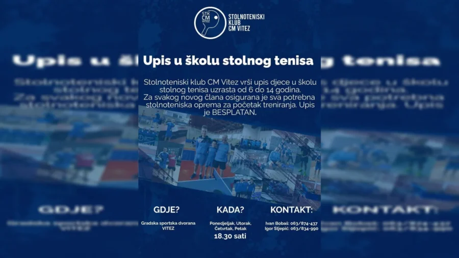 U tijeku je upis djece od 6 do 16 godina u školu stolnog tenisa. Ovo je idealna prilika za sve mališane koji žele naučiti osnove jednog od najatraktivnijih i najrasprostranjenijih sportova na svijetu. Stolni tenis potiče razvoj motorike, koordinacije, brzine i koncentracije, a ujedno donosi mnogo zabave. Za sve nove članove Stolnoteniski klub CM Vitez osigurao je besplatnu opremu za početak treniranja, a upis je besplatan.
