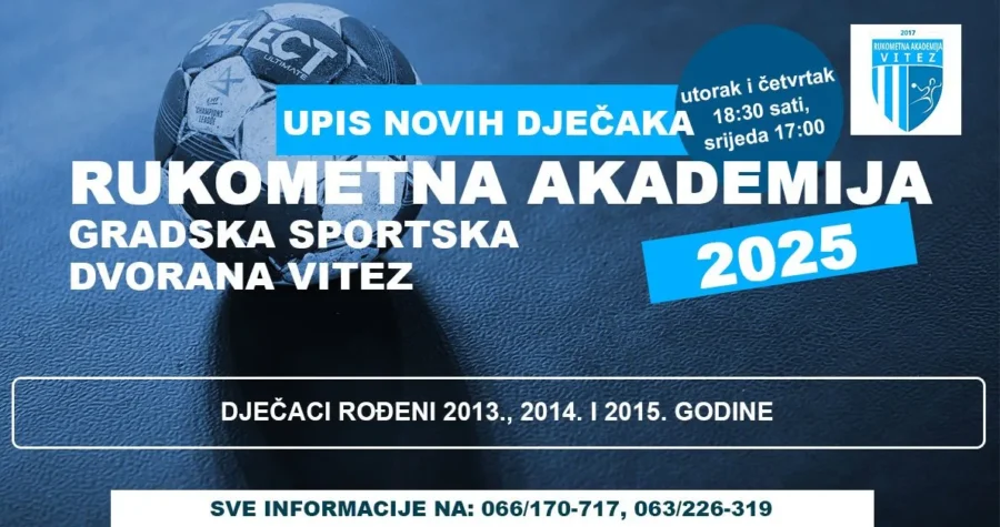 Rukometna akademija Vitez započinje upis novih dječaka rođenih 2013., 2014. i 2015. godine. Treninzi će se održavati u Gradskoj sportskoj dvorani Vitez, i to utorkom i četvrtkom u 18:30 sati te srijedom u 17:00 sati.