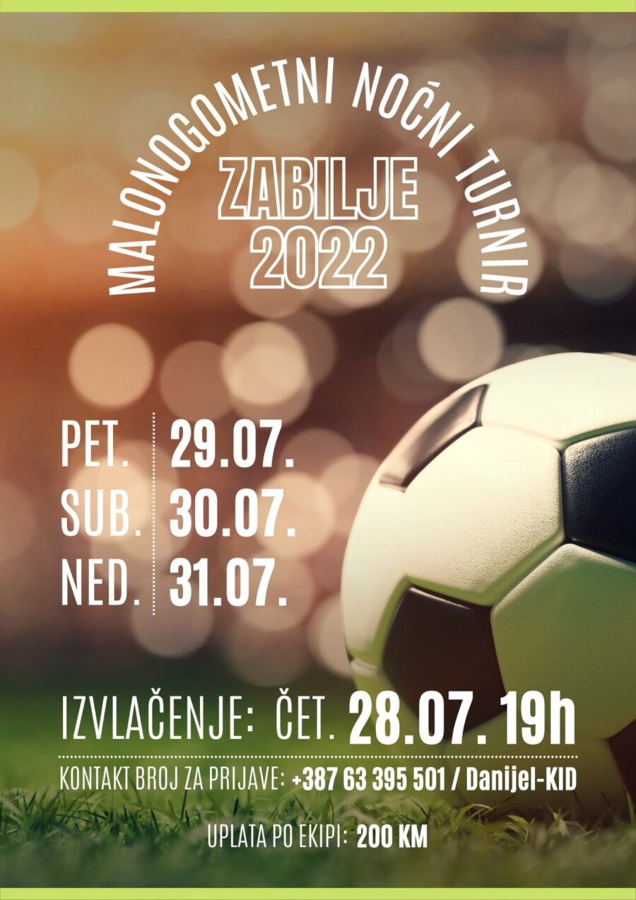 Tradicionalni malonogometni noćni turnir bit će održan i ovoga ljeta u naselju Zabilje kod Viteza. Kako najavljuju organizatori turnir će biti održan od 29. do 31. srpnja 2022. godine, dok je izvlačenje parova u četvrtak, 28. srpnja. Kotizacija za sudjelovanje iznosi 200,00 KM,