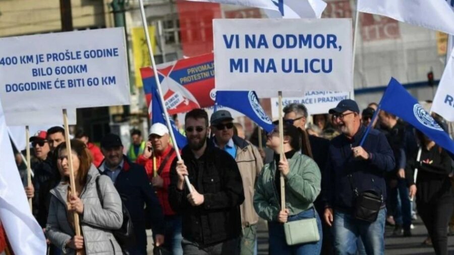 Prosvjedi pod nazivom “Kada smo mi na redu?” počeli su jutros u 8:30 sati ispred zgrade Parlamentarne skupštine Bosne i Hercegovine, a tokom okupljanja istaknuli su i različite transparente poput “ili dostojanstvena plaća ili red za vize”, “i kaserka želi na more za 1. svibanj”.