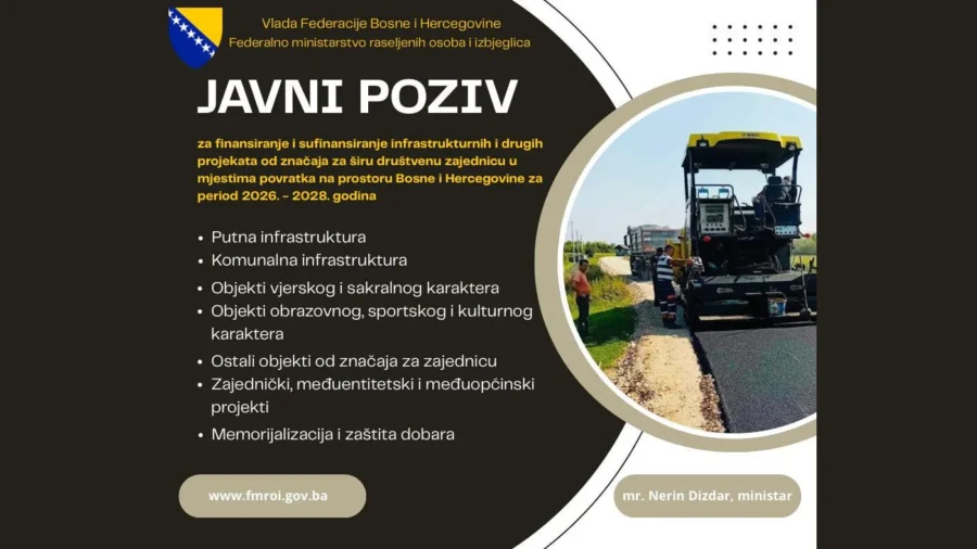 Federalno ministarstvo raseljenih osoba i izbjeglica objavilo je javni poziv za financiranje i sufinanciranje infrastrukturnih i drugih projekata od značaja za širu društvenu zajednicu u mjestima povratka na prostoru Bosne i Hercegovine za razdoblje 2026. – 2028. godine.