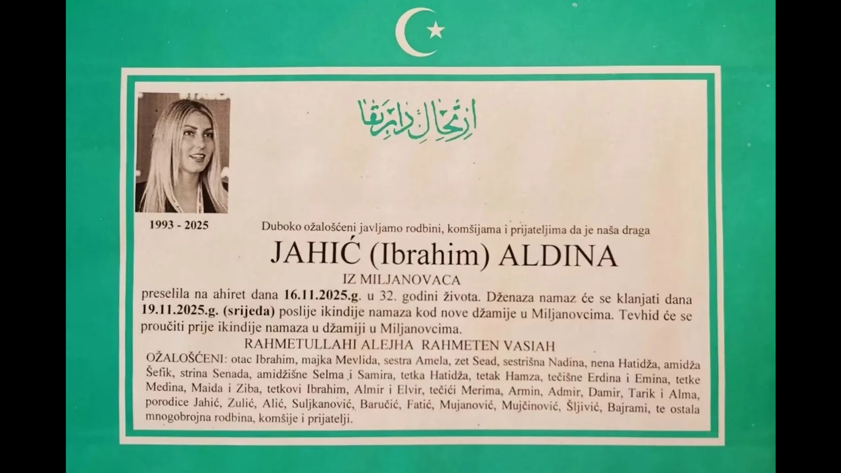 Dženaza Aldini Jahić klanjat će se u srijedu 19.11. u Miljanovcima kod Kalesije. Dženaza namaz će se klanjati nakon ikindije namaza kod Nove džamije u Miljanovcima. Tevhid će se proučiti prije ikindije namaza u džamiji u Miljanovcima.