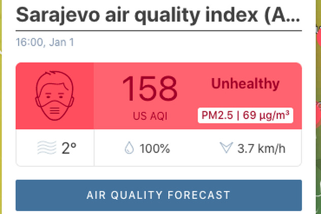 Prema podacima koje bilježi stranica AirVisual indeks – (ne)kvaliteta zraka u Sarajevu iznosi 158, što znači da je glavni grad Bosne i Hercegovine trenutno 15. na listi najzagađenijih u svijetu.