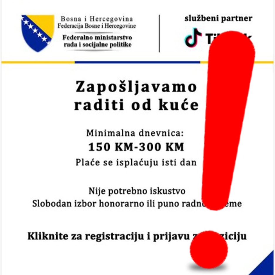Kroz korisnički profil Acqgk-43, ID: 494468583202007, na ovim platformama objavljen je sponzorirani oglas u kojem se lažno tvrdi da su Ministarstvo rada i socijalne politike i platforma TikTok službeni partneri izvjesnog programa zapošljavanja za rad od kuće uz minimalnu dnevnicu od 150 KM do 300 KM.