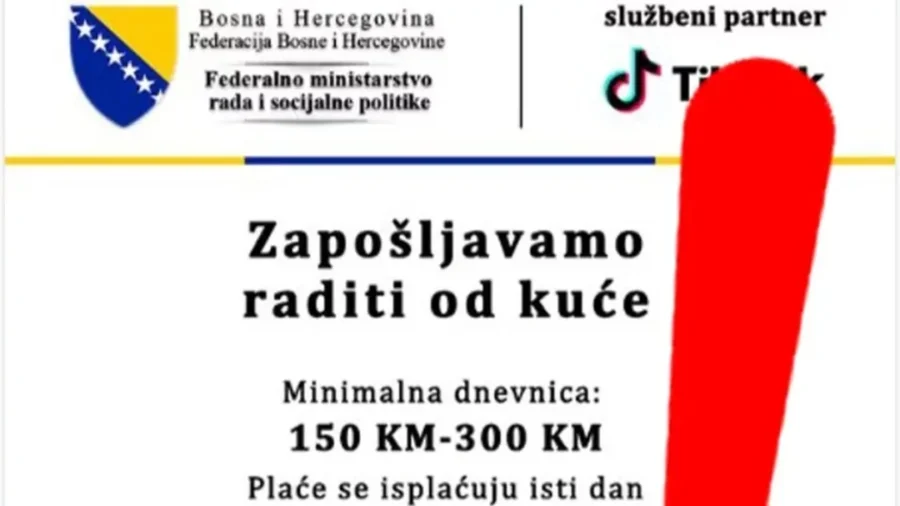 Kroz korisnički profil Acqgk-43, ID: 494468583202007, na ovim platformama objavljen je sponzorirani oglas u kojem se lažno tvrdi da su Ministarstvo rada i socijalne politike i platforma TikTok službeni partneri izvjesnog programa zapošljavanja za rad od kuće uz minimalnu dnevnicu od 150 KM do 300 KM.