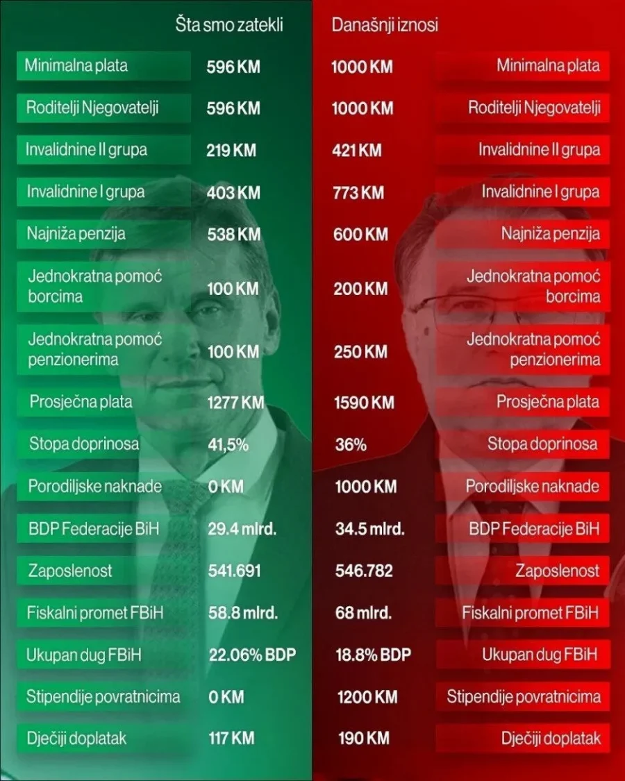 Tako su naveli da su, pri preuzimanju federalne vlasti (op.a. od tadašnjeg premijera Fadila Novalića), zatekli iznos minimalne plaće od 596 KM dok ona sada iznosi 1.000 KM te kako je najniža mirovina iznosila 538 KM, a sada je 600 KM. Prosječna plaća je, ističe SDP, prije nekoliko godina iznosila 1.277 KM, a sada 1.590 KM. Kažu i da je ukupan dug FBiH iznosio 22,05 posto BDP-a dok je sada 18,8.